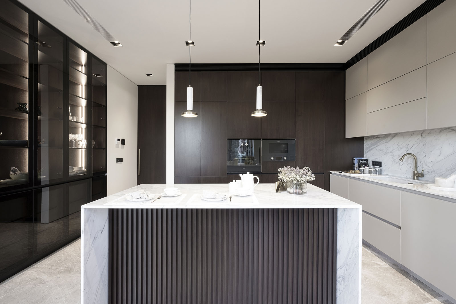 The kitchen is the heart of the home: an essential and refined space, characterized by the interplay between light surfaces, full volumes, and dark finishes with a solid wood effect. The central island, the focal point of the space, becomes a meeting place and operational hub, emphasized by high-quality materials and precise lighting that enhances its geometry. This context is complemented by Bugnatese Kobuk single-lever taps in brushed nickel, an elegant and discreet finish that consistently accompanies the style of the room.